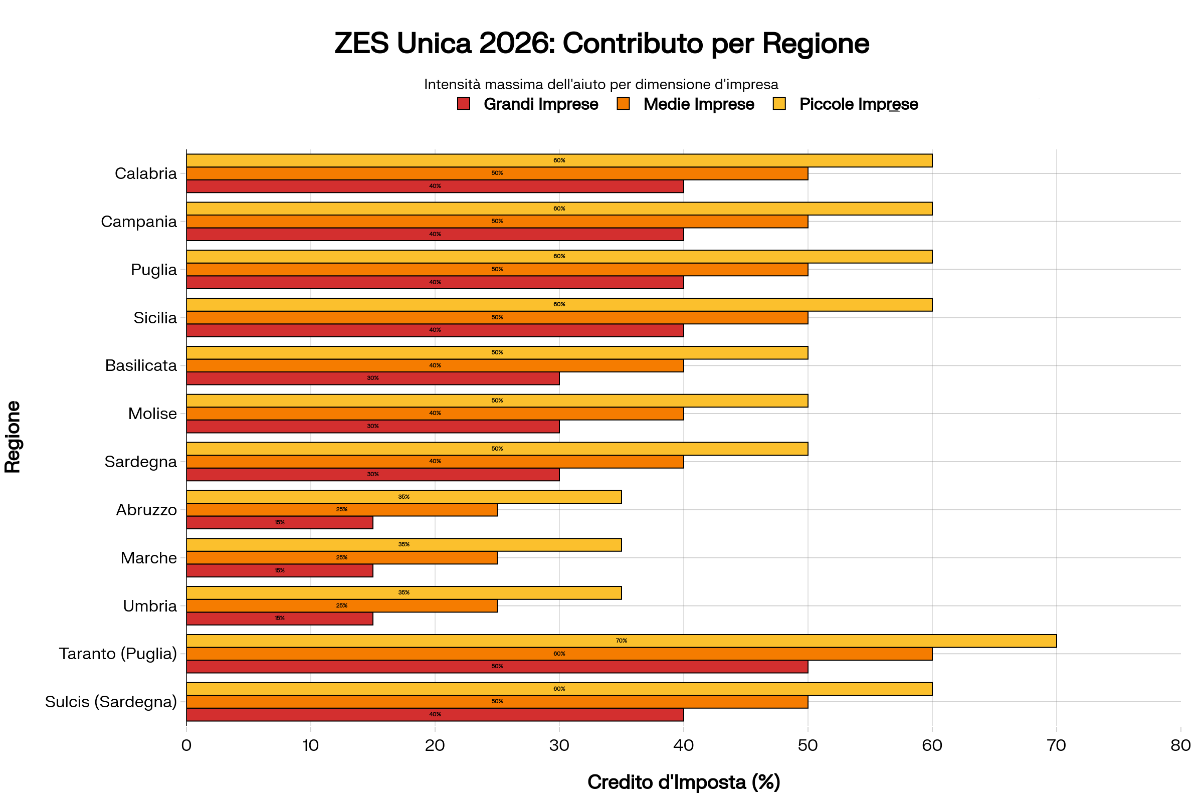 Le aliquote più basse spettano invece all'Abruzzo e alle due "new entry" dell'area ZES, Marche e Umbria: per questi territori l'asticella si ferma al 35% (piccole), 25% (medie) e 15% (grandi).